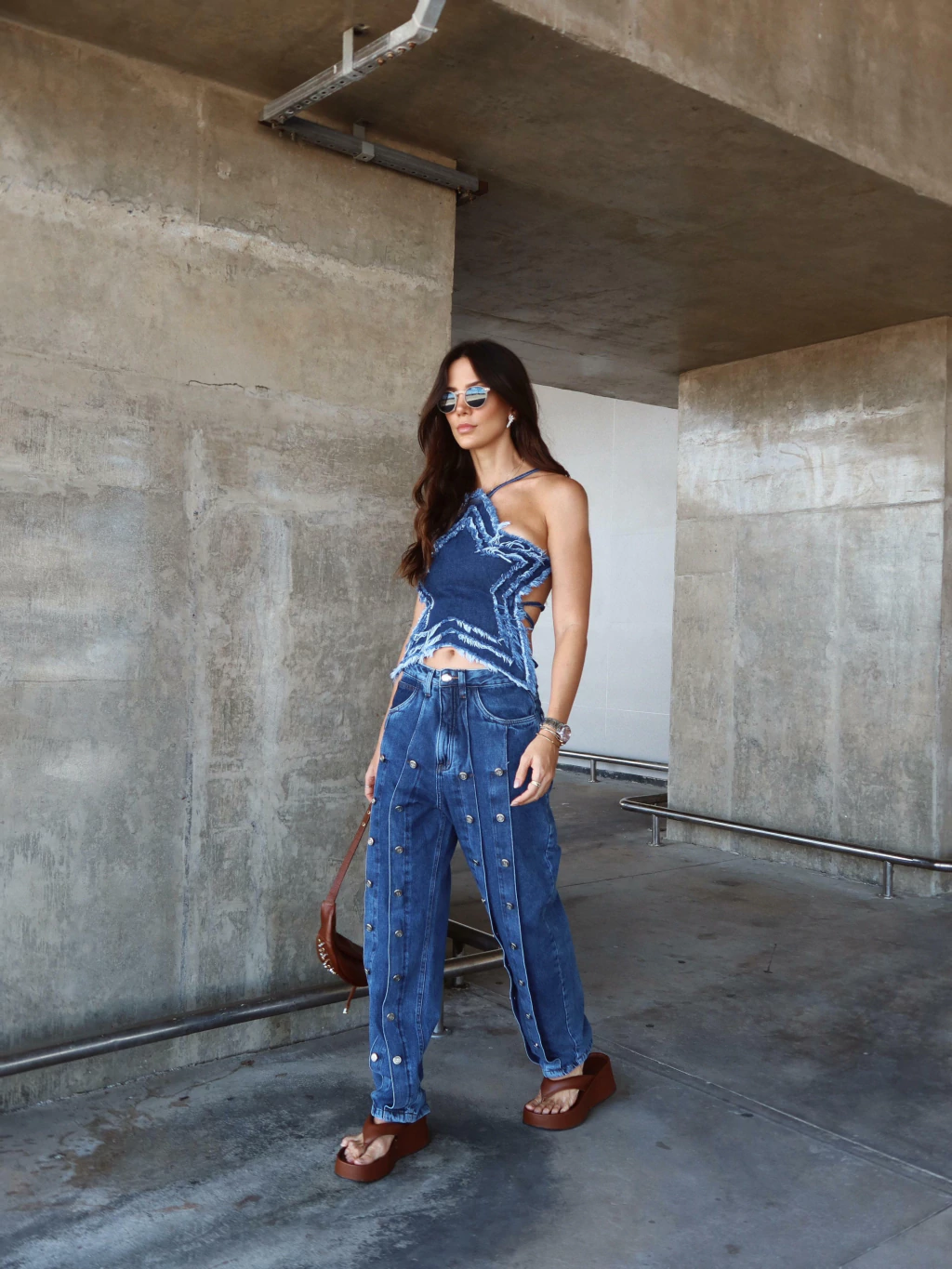 Feita em denim encorpado de alta qualidade, a calça oferece conforto e estrutura ao mesmo tempo. É aquela peça fashionista que transforma qualquer look simples em uma composição marcante. Combine com cropped, camisas oversized ou até com salto e blazer para um hi-lo super fashion!