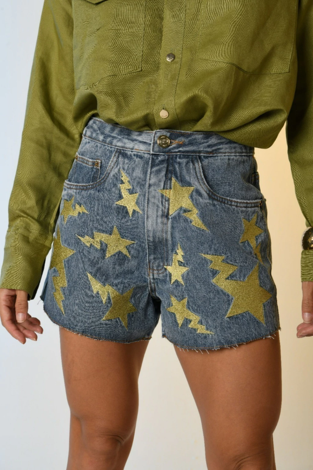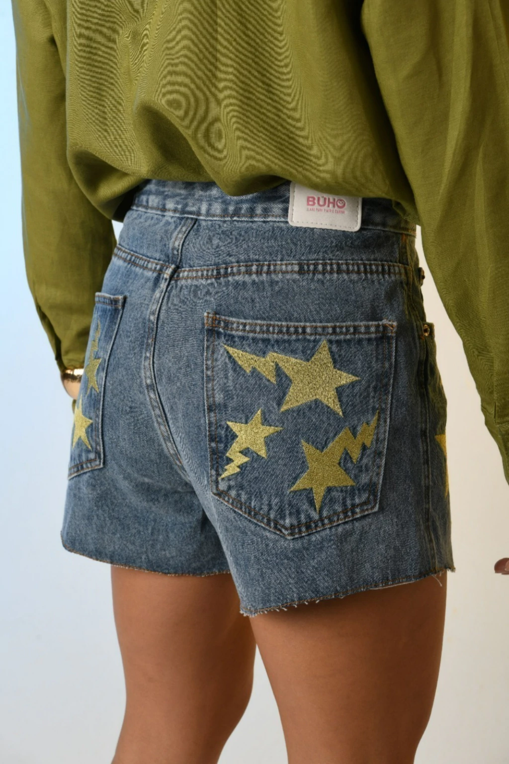 O Short Eloisa traz o toque de personalidade que faltava no seu guarda-roupa! Com uma lavagem moderna e estampa vibrante de estrelas e raios dourados, ele é perfeito para looks autênticos e cheios de atitude. O acabamento desfiado na barra acrescenta um charme extra, garantindo um visual descontraído e cheio de estilo.