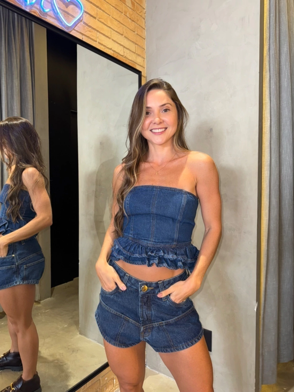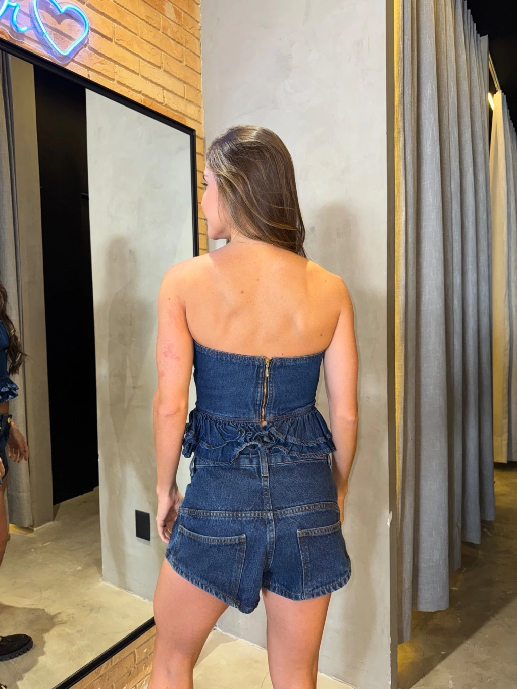 Sua modelagem tomara que caia valoriza o colo e os ombros, trazendo sensualidade na medida certa. O detalhe em babados confere um toque romântico, sem perder o ar descolado que o jeans proporciona. Uma peça-chave para compor produções versáteis — desde looks casuais até composições mais elaboradas.