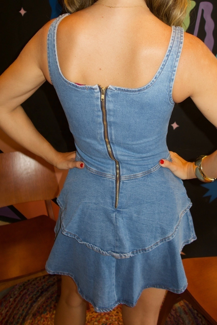 Confeccionado em jeans leve e estruturado, ele combina o charme casual do denim com um toque moderno e feminino. O diferencial fica por conta da modelagem ajustada no busto, por conta do jeans com elastano e da saia com babado em camadas, que valoriza as curvas com delicadeza e fluidez.